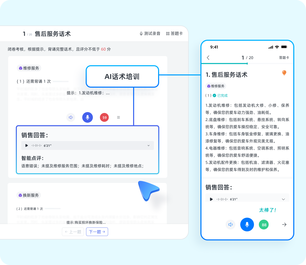 利用智能陪练系统,我们能够迅速提升销售服务水平,有效缩短新人上岗时间。这不仅有助于企业全面降本增效,更能够提升客户满意度,增强市场竞争力。