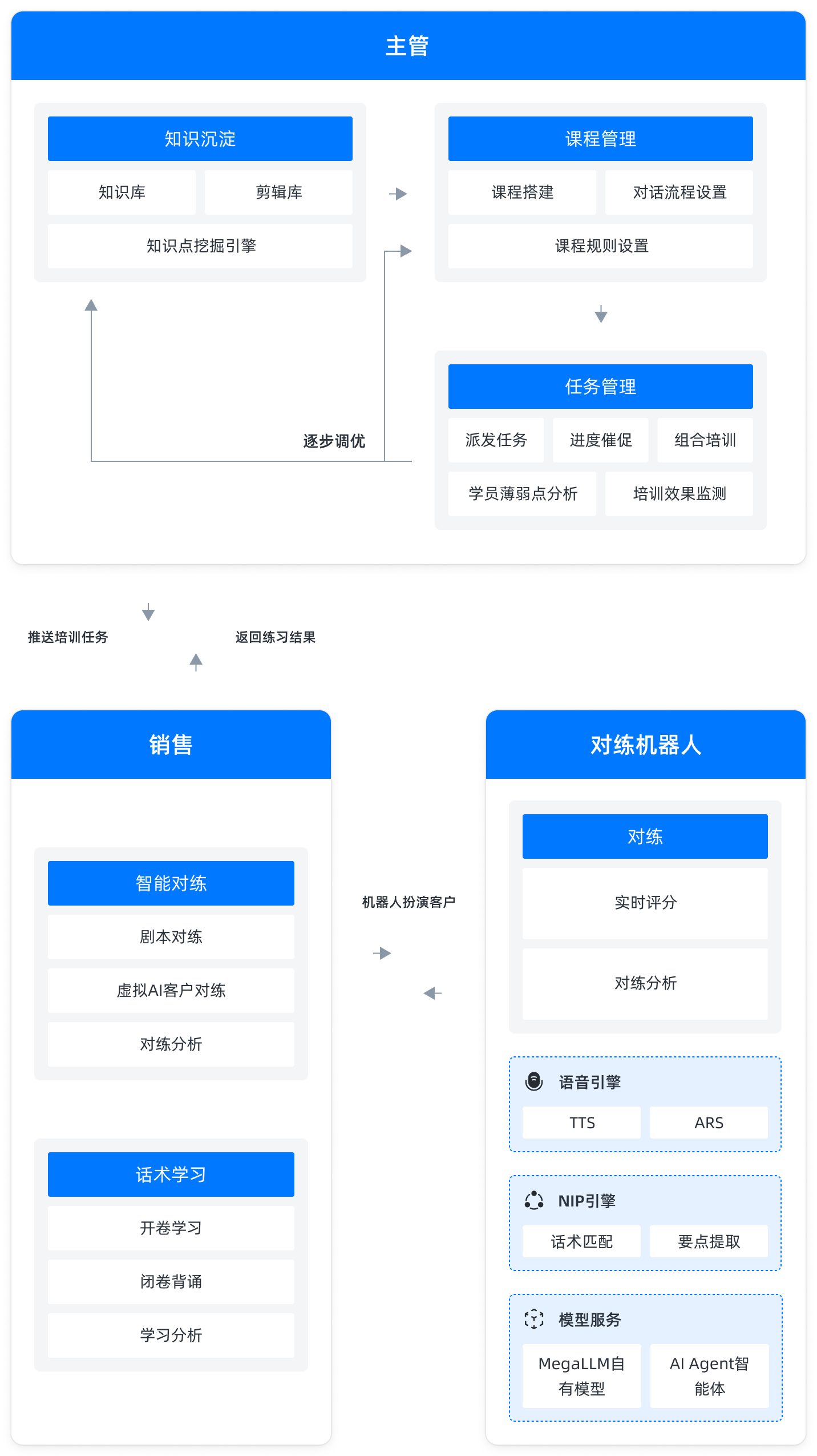 “通过NLP,NLU,ASR,TTS等AI技术,使销售可以进行全流程的实战模拟对话练习。”