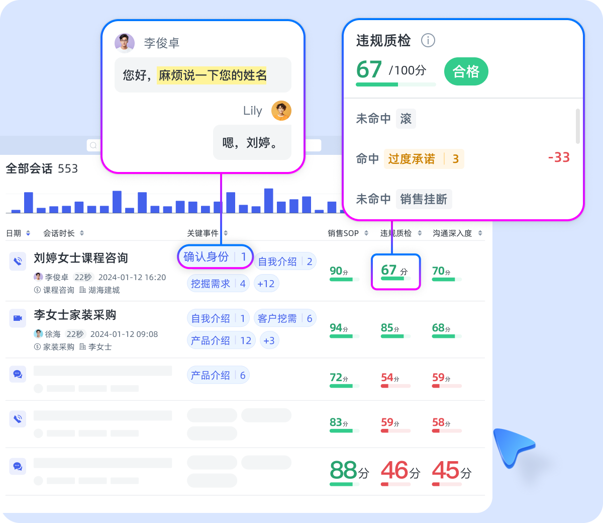 AI全量、全自动:智能质检系统实现全自动评分,覆盖所有沟通数据,消除人工抽检盲区,大幅减少风险。