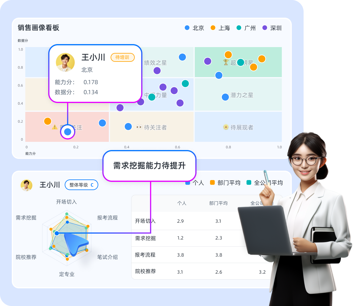 构建个人能力模型,针对性提升业务:根据业务情况构建员工能力评估模型,快速识别员工的优势和短板。